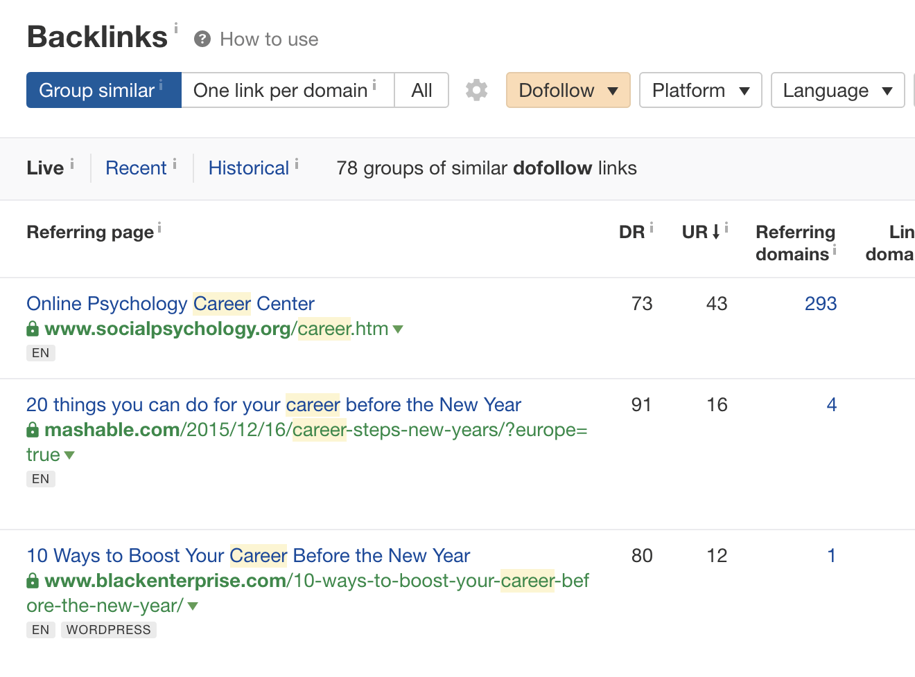 如果你把这个关键词排名最高的页面插入Ahrefs网站分析并检查外链报告,你会看到很多提供职业建议的页面的外链。