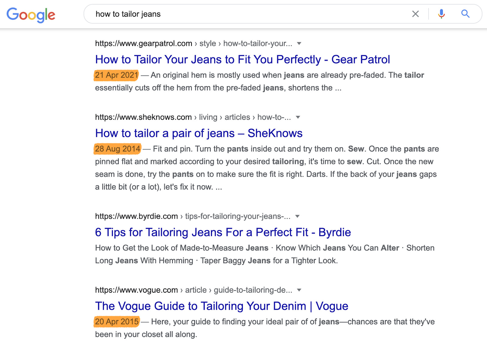 尽管最近发布了一些搜索结果,但一些排名靠前的自然搜索结果是在2014年发布的。这是因为结果的新鲜度并不重要。今天裁剪牛仔裤的过程与十年前大体相同。