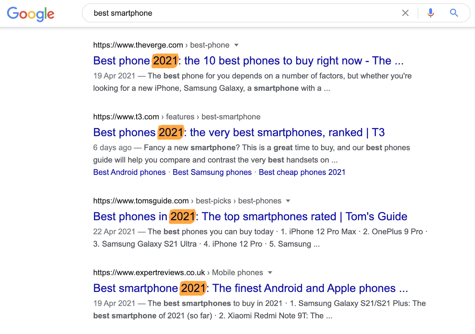 以“最佳智能手机”这样的关键词为例,所有的结果都是最近发布的。