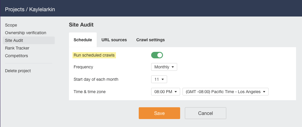 通过每月的网站诊断,您可以随时了解到产生的问题。你可以使用 Ahrefs Site Audit(网站诊断)中的日程安排功能轻松做到这一点。