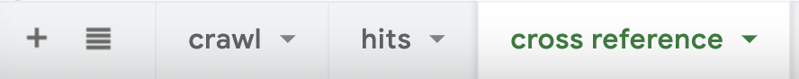 你已经进入了最后的阶段。最后一步是交叉引用可抓取的 URL (来自 Ahrefs 网站诊断)和有点击的URL(来自 GA 和 GSC)。要做到这一点,创建一个空白的谷歌工作表,并创建三个标签。给它们贴上抓取(crawl)、点击(hits)和交叉引用(cross reference)的标签。