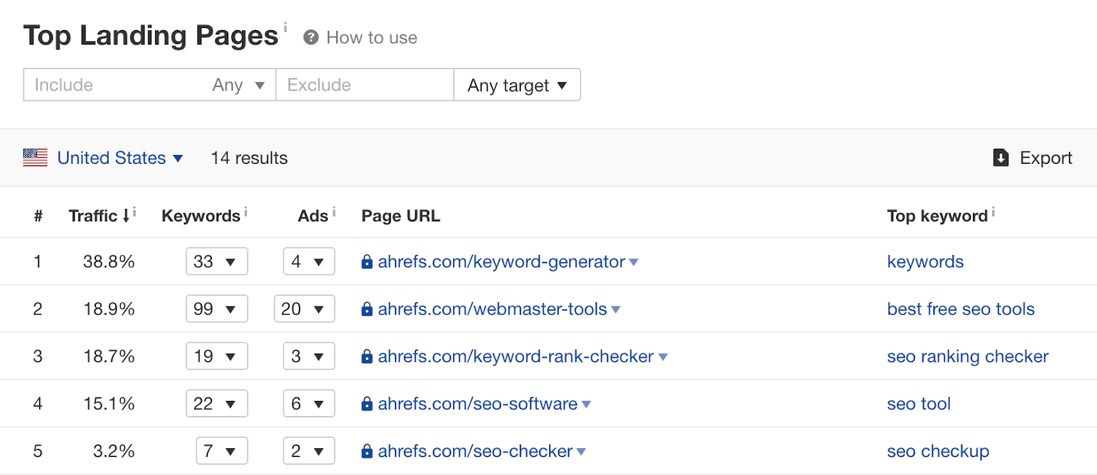Ahrefs的网站分析 的顶级着陆页中,付费搜索的“热门着陆页”报告显示了任何网站上的页面,哪一个从 Google 的搜索广告中获得了最多的流量。