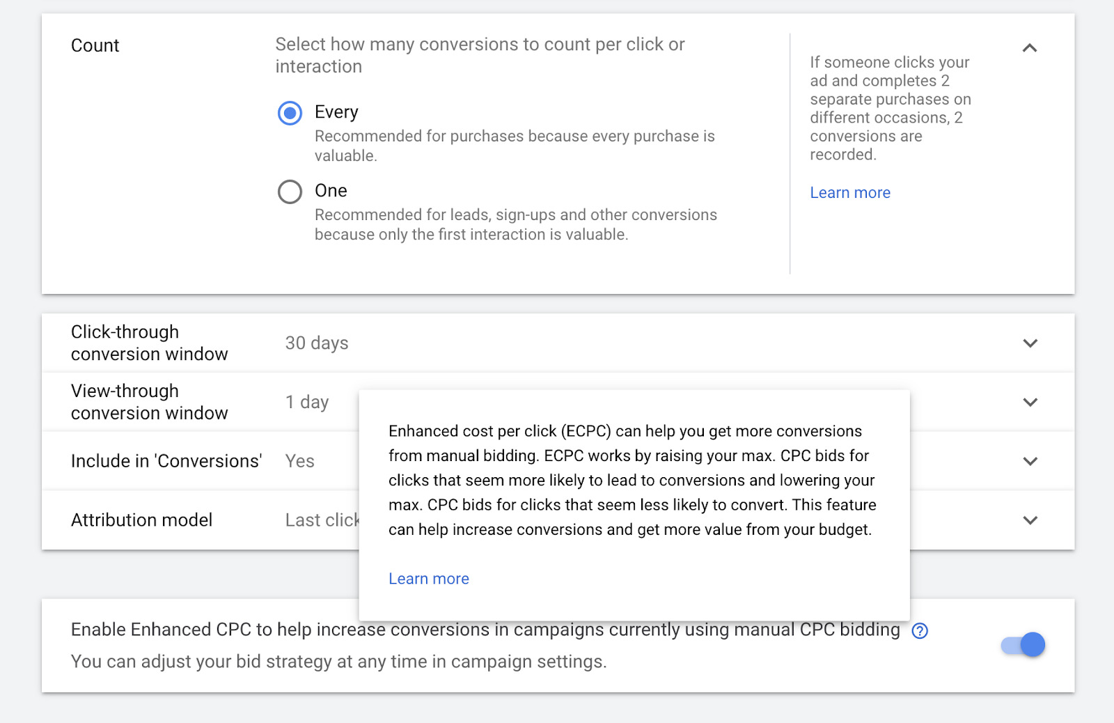 设置转化率还可以让你利用谷歌的机器学习算法,这些算法可以帮助你优化性能,从而获得更多的数量和价值转化。增强型 CPC (eCPC)是您应该使用的第一个很好的示例。