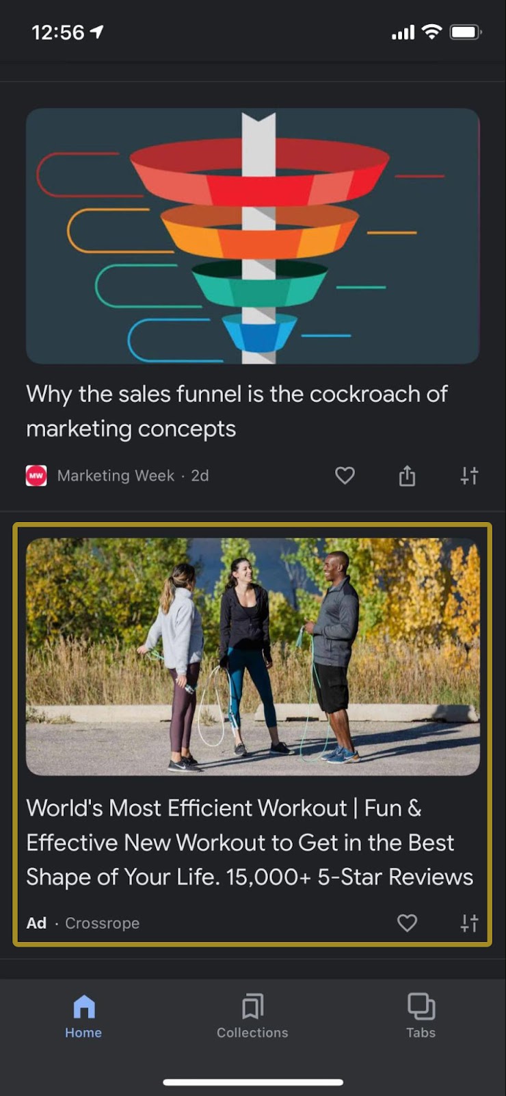 这是谷歌广告中最新的广告类型。发现活动的重点是谷歌发现的广告,基于你的在线活动,自动生成和高度个性化的移动端数据供稿。它显示关于你感兴趣的话题的信息和新闻,比如 SEO 或者高尔夫。