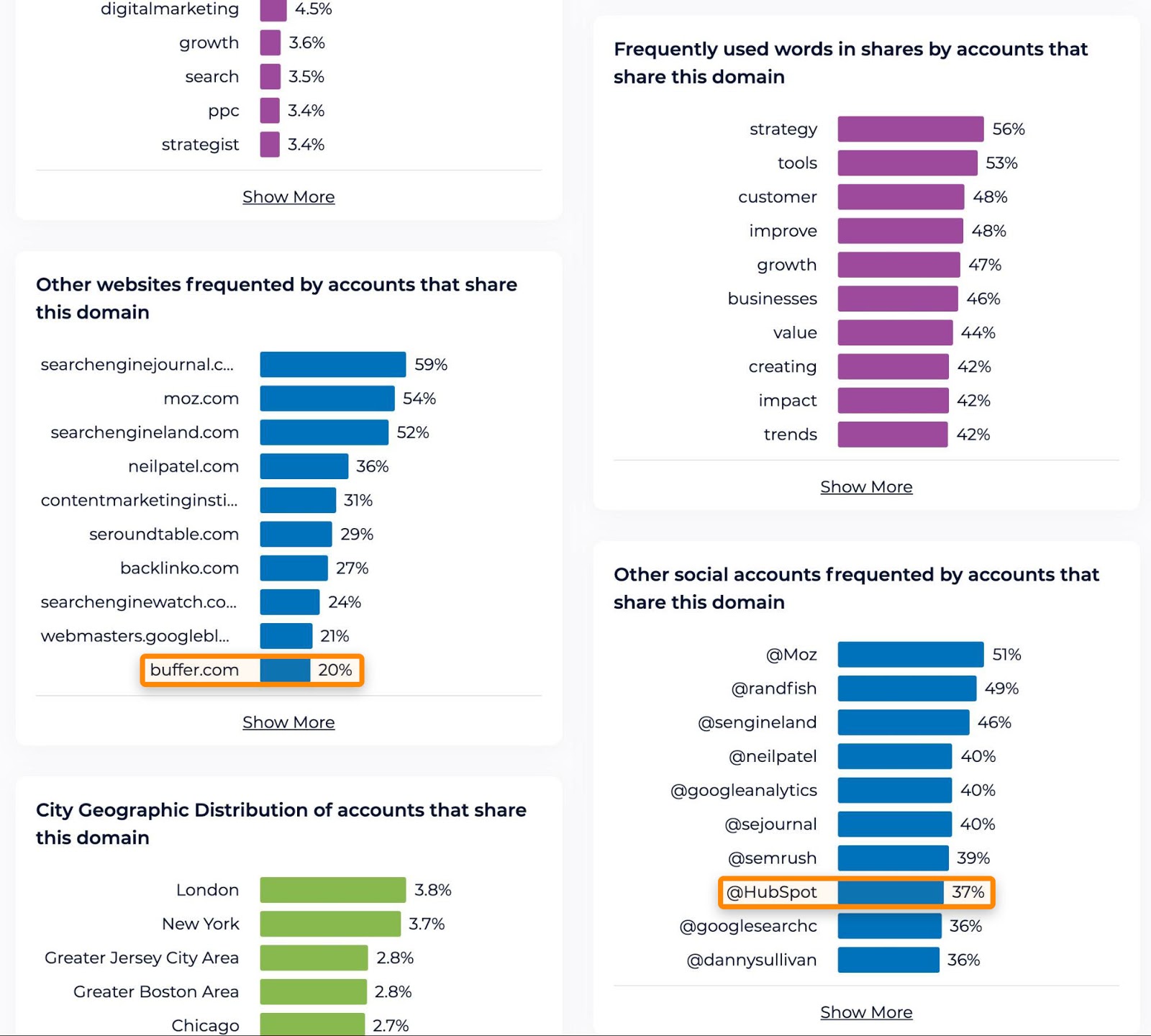 不过,互补产品因素在B2B中发挥了作用。 如果您需要可以与之合作的公司的新想法,请使用受众调查工具,例如Sparktoro。 这是我插入ahrefs.com时获得的免费版本的摘录: