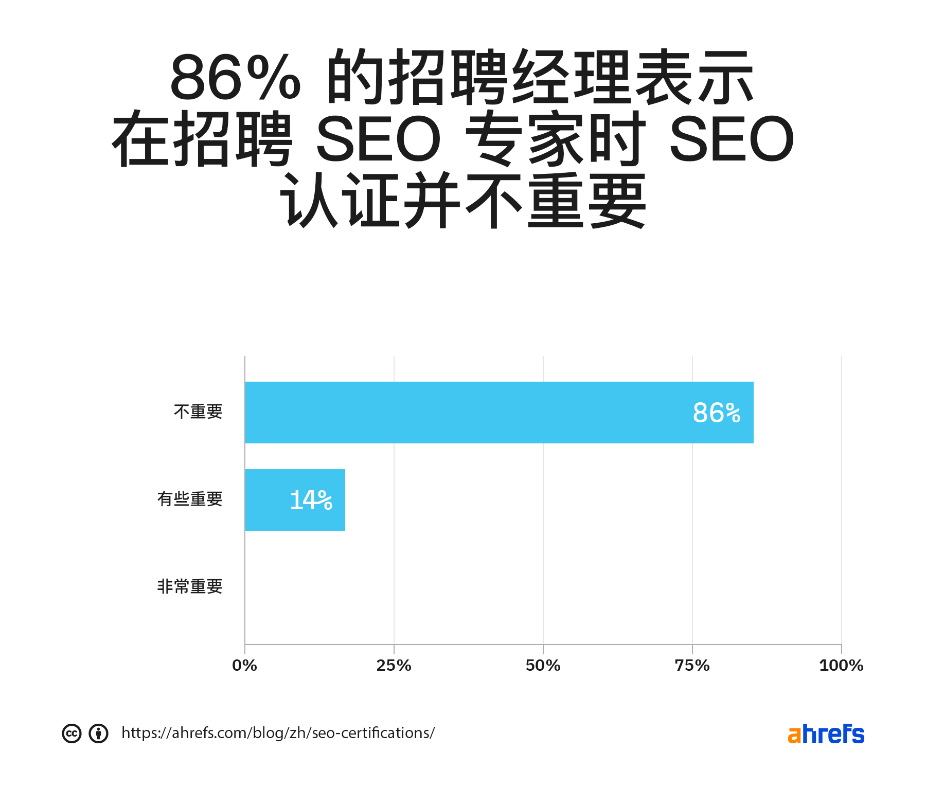 我们询问15位 SEO 招聘经理,询问了他们在招聘 SEO 专家时,认为重要的技能和要求。86% 的人认为搜索引擎优化认证并不重要,其他人则认为它们只是稍微重要一点。