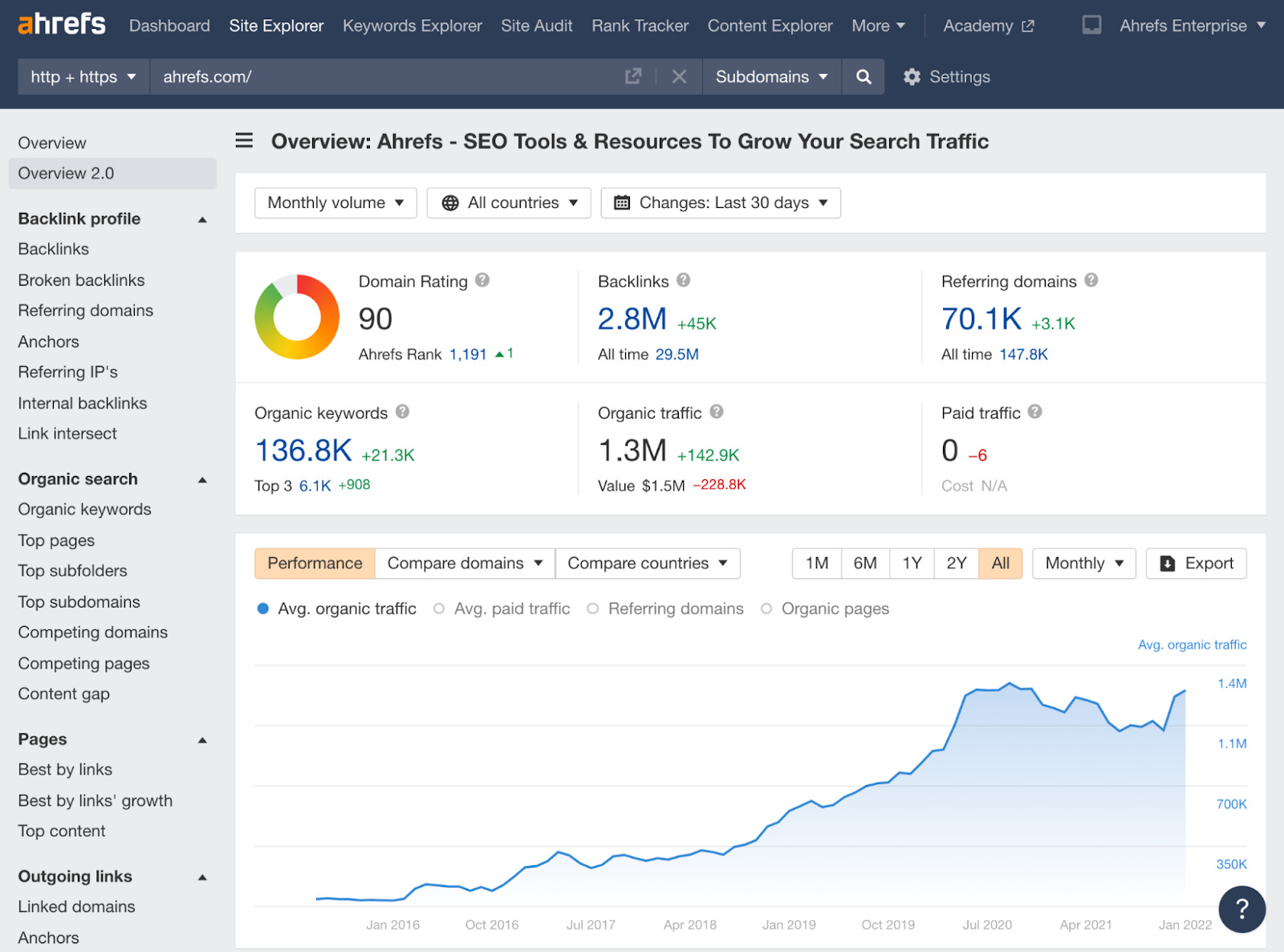 你可以打开 Ahrefs 的网站分析,插入其中一个网站,查看概览中的自然流量图: