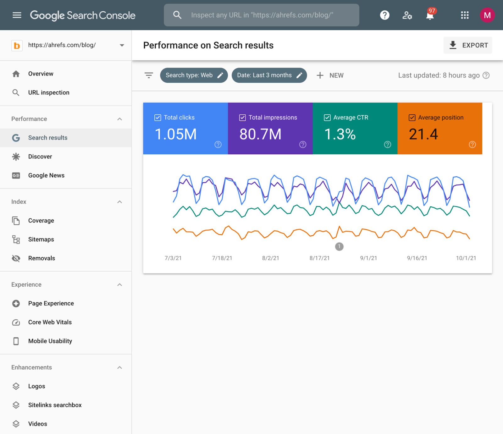 Google Search Console 中的 “性能” 选项卡将为你提供一段时间内自然流量的最准确视图: