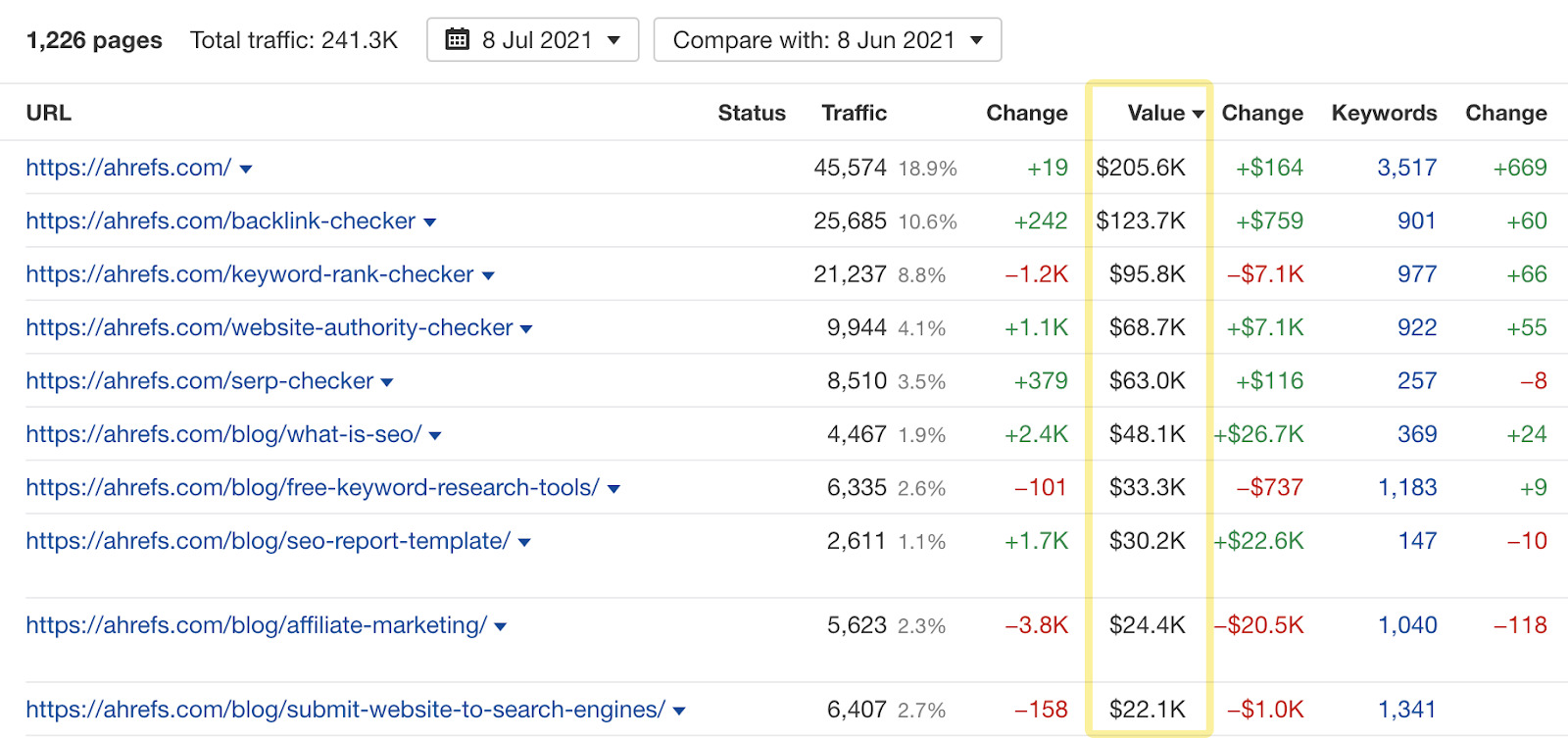 但你也可以更深入地了解页面的流量价值。为此,请在 Site Explorer(网站分析)中打开 Top Pages(热门页面)报告,并按流量值对页面进行排序,以查看最有价值的页面: