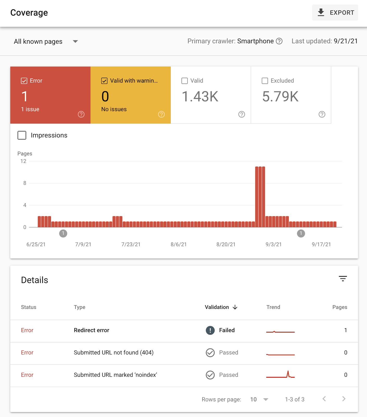 索引覆盖率错误数量同样很重要。这些错误有可能是你在无意间使用 noindex robots 元标记导致的。