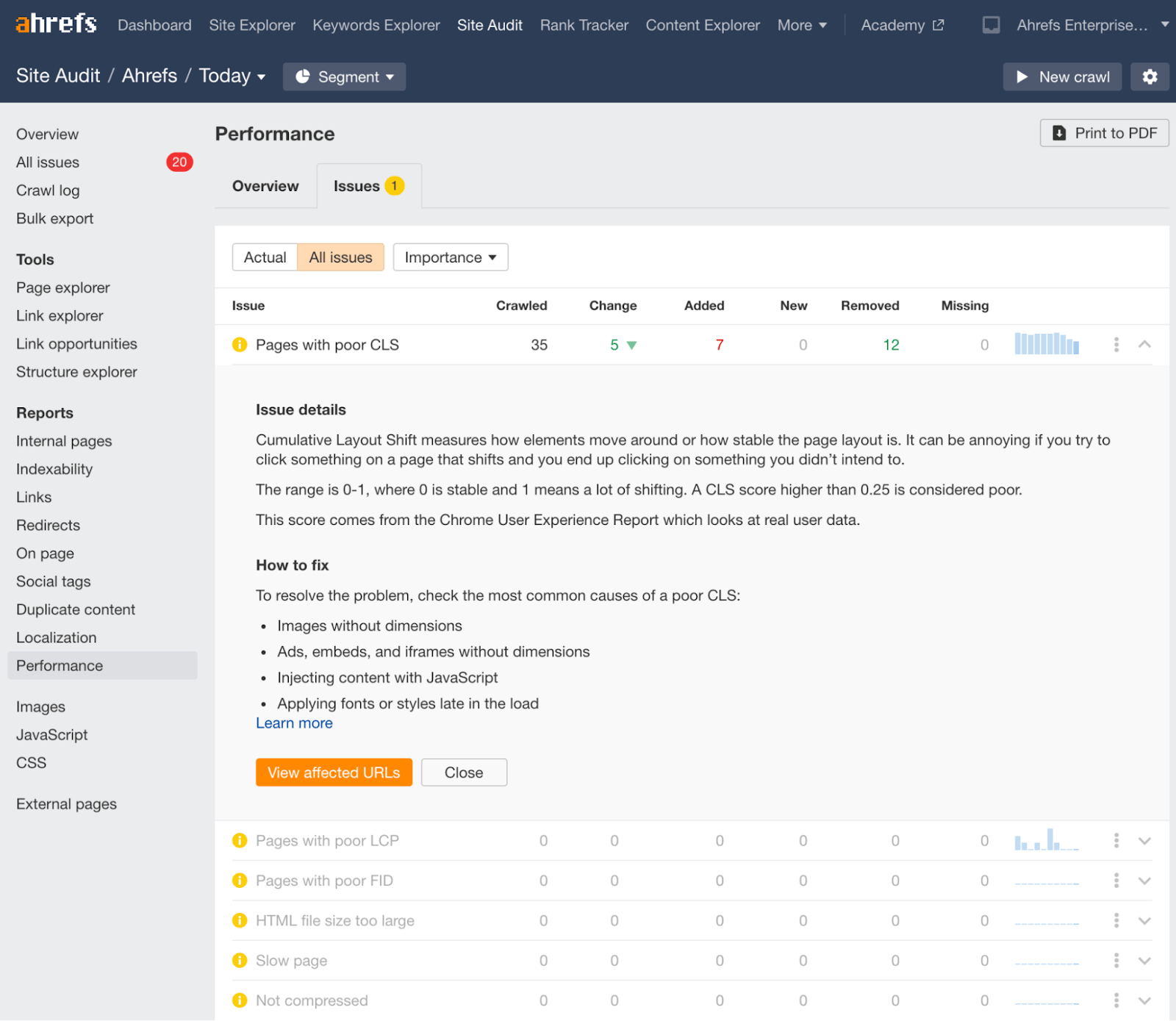 或者,你可以再次使用 Ahrefs Site Audit(网站诊断),检查 Performance(性能)报告并查看 CWV 指标: