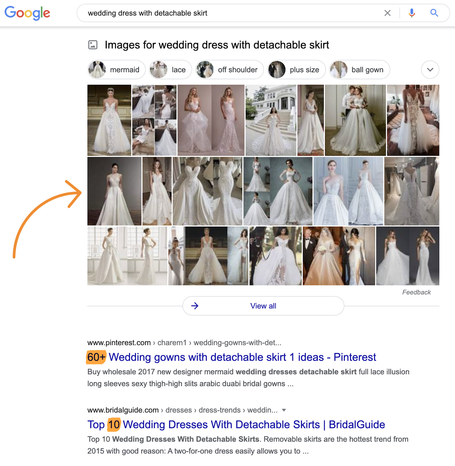 例如,搜索“可拆卸裙子的婚纱”考虑到在搜索结果页面顶部有一个图片包,顶部的页面都是列表,很明显这主要是一个信息搜索,搜索者需要灵感。