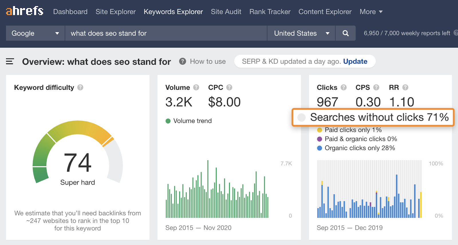 例如,如果我们在 Ahrefs 的关键词分析中检查“ seo 代表什么”的点击分布,估计有71% 的搜索结果没有点击。