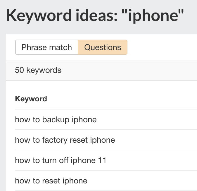 要找到人们提出的问题,请查看 Ahrefs 关键词分析中的问题报告。