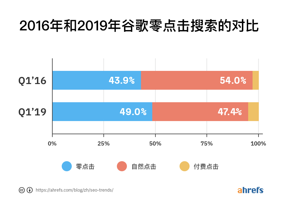 在2016年至2019年之间,零点击搜索的数量从43.9%上升至49%。