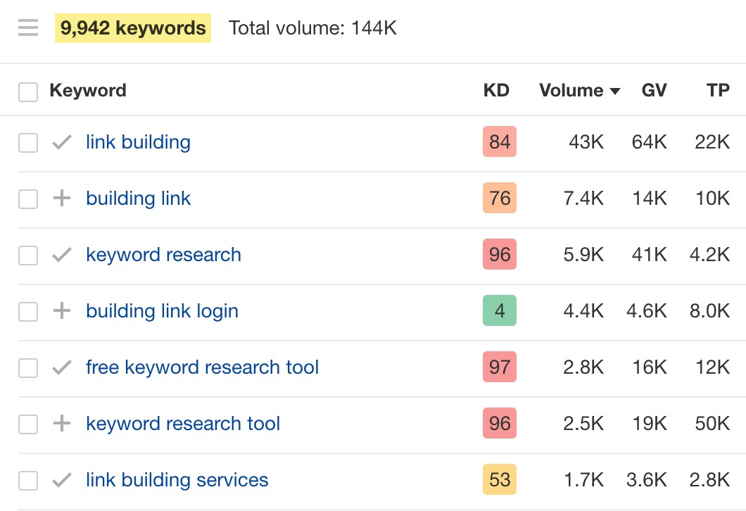 最简单的方法是寻找人们正在搜索的主题,以及在哪里自然会写博客文章来促进你的业务。例如,如果我们在 Ahrefs 的关键词分析 中输入一些与我们的业务相关的主题,然后检查关键词匹配报告,我们会看到成千上万的关键词创意。
