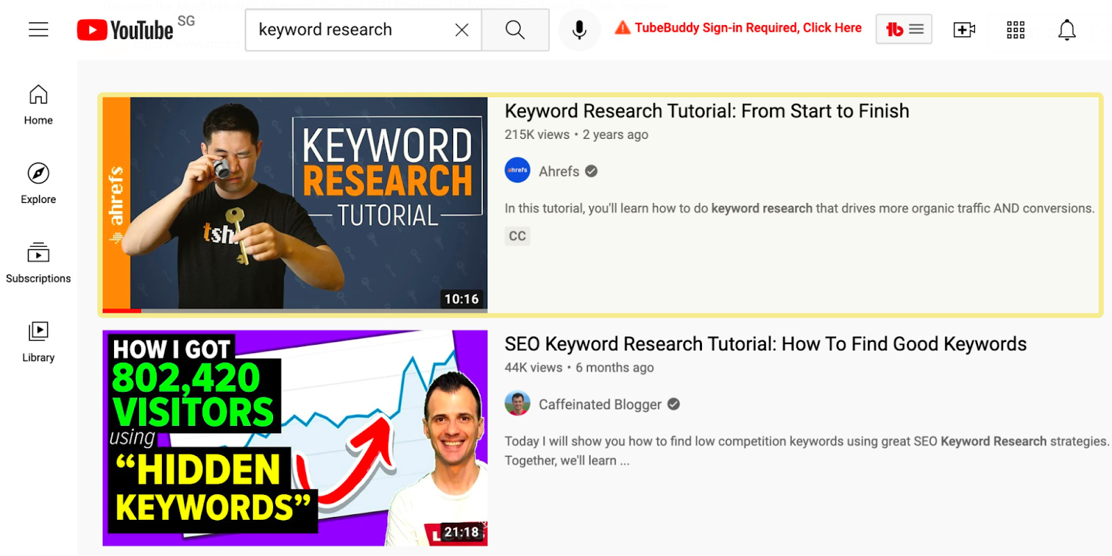 这就是我们建立 YouTube 频道的方式。我们的主要重点最初是排名良好的关键词相关的业务。例如,如果我们看一下“关键词研究”这个主题,你可以看到我们在这个主题上排名第一,每个月有数以千计的浏览量。