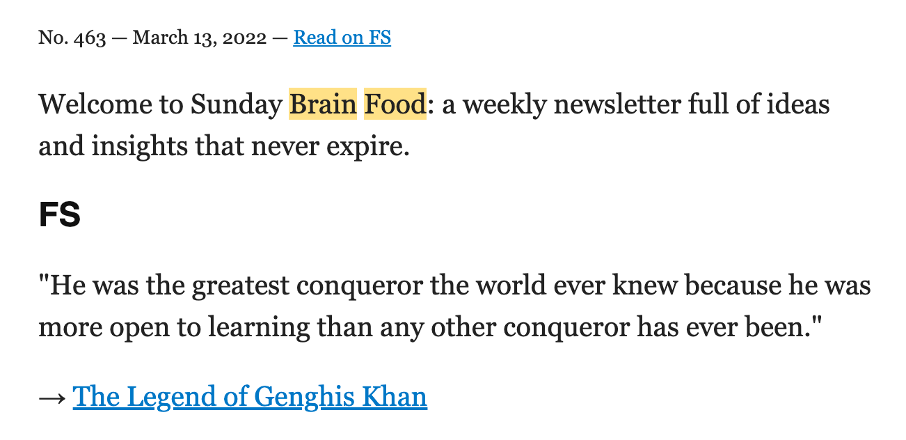每周,Farnam Street 的创始人 Shane 都会发送一份时事通讯,其中包括他当周发布的帖子: