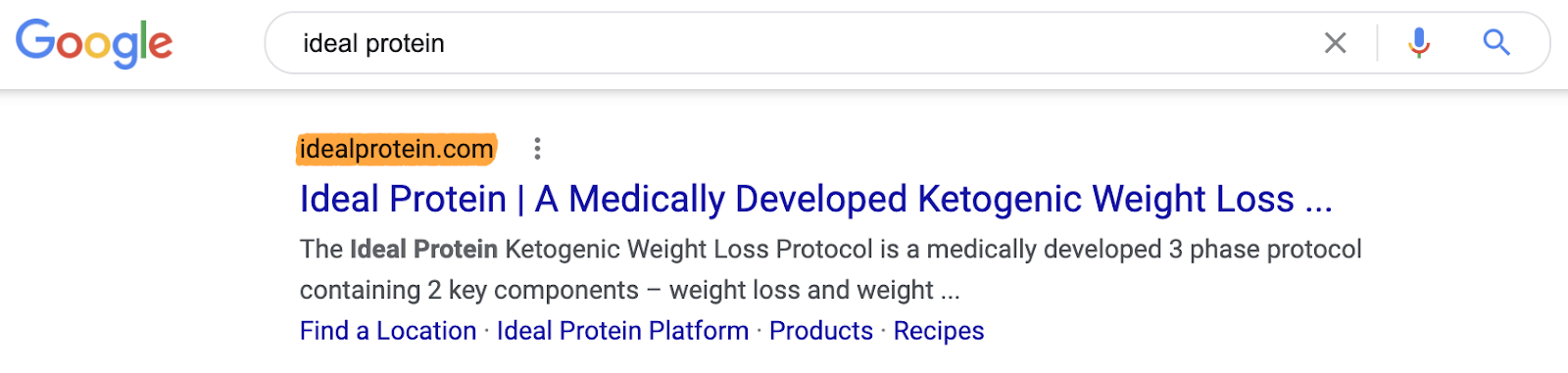 排名第一的结果是 idealprotein.com。很明显就可有看出用户在寻找一个特定的网站,这是一个导航类搜索。