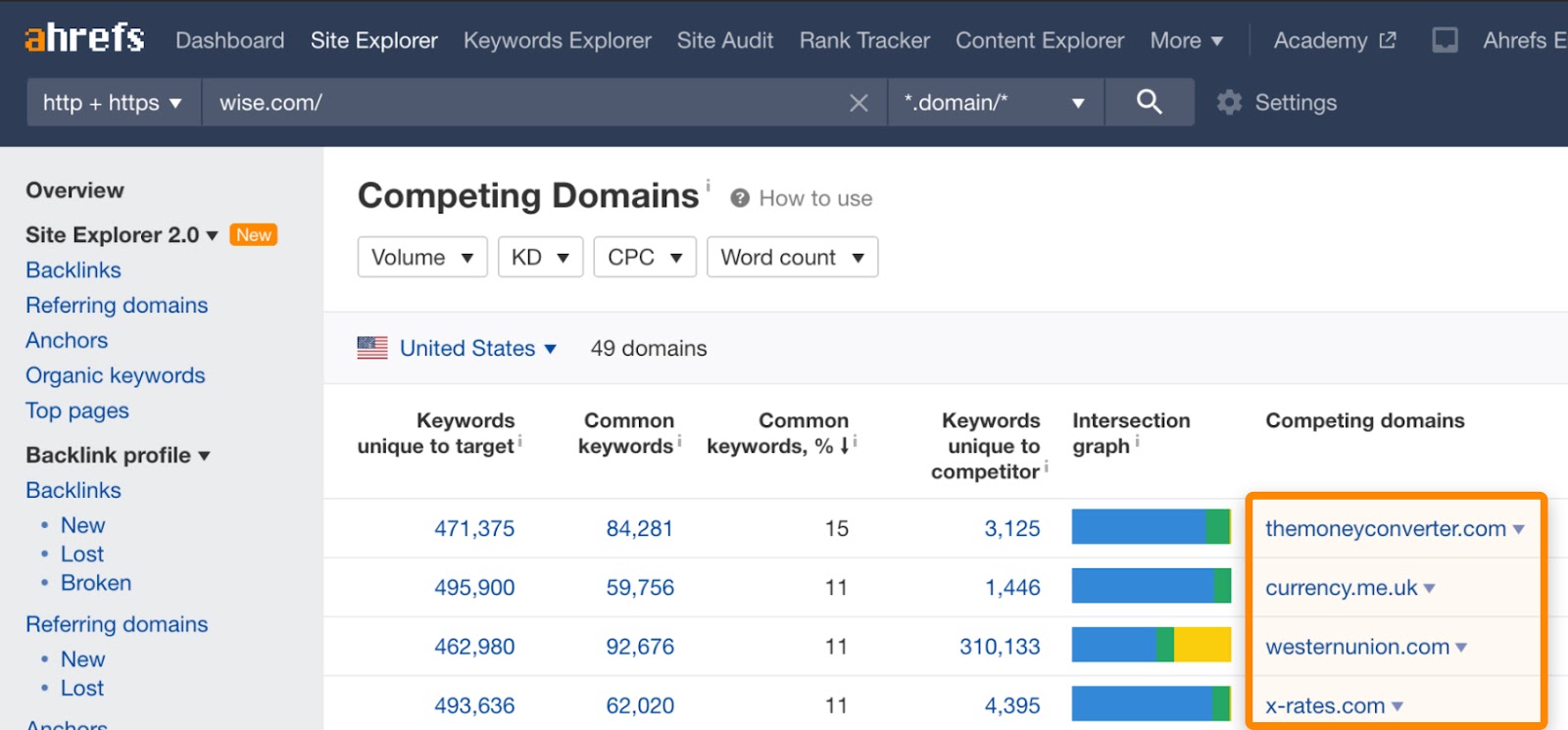 以下是我在 Ahrefs Site Explorer(网站分析)中为我想要调查的每个网站执行此操作的方法: