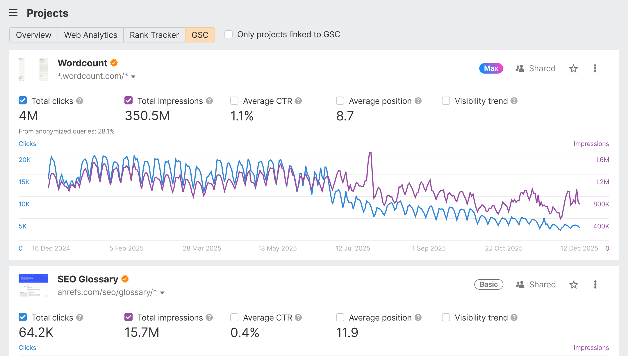 Your keywords and pages get paired with Ahrefs metrics and insights.