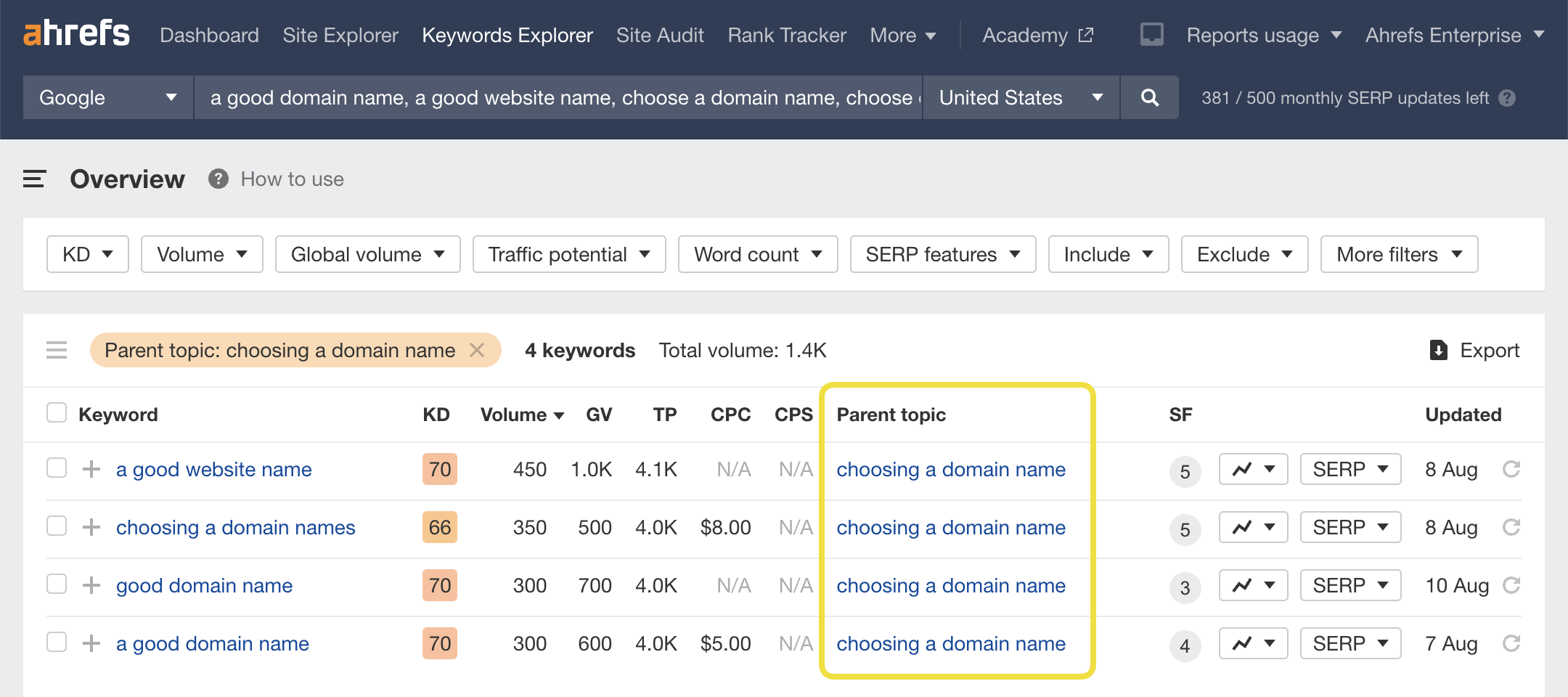 Look for groups of keywords with the same Parent Topic to find long-tail variations and subtopics.