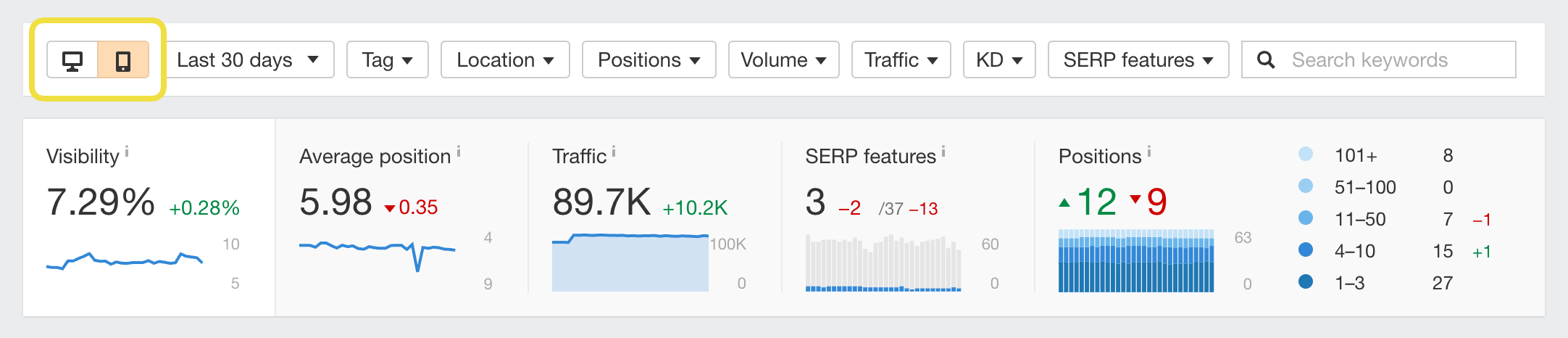 Positions: Increases and decreases in rankings across all tracked keywords.