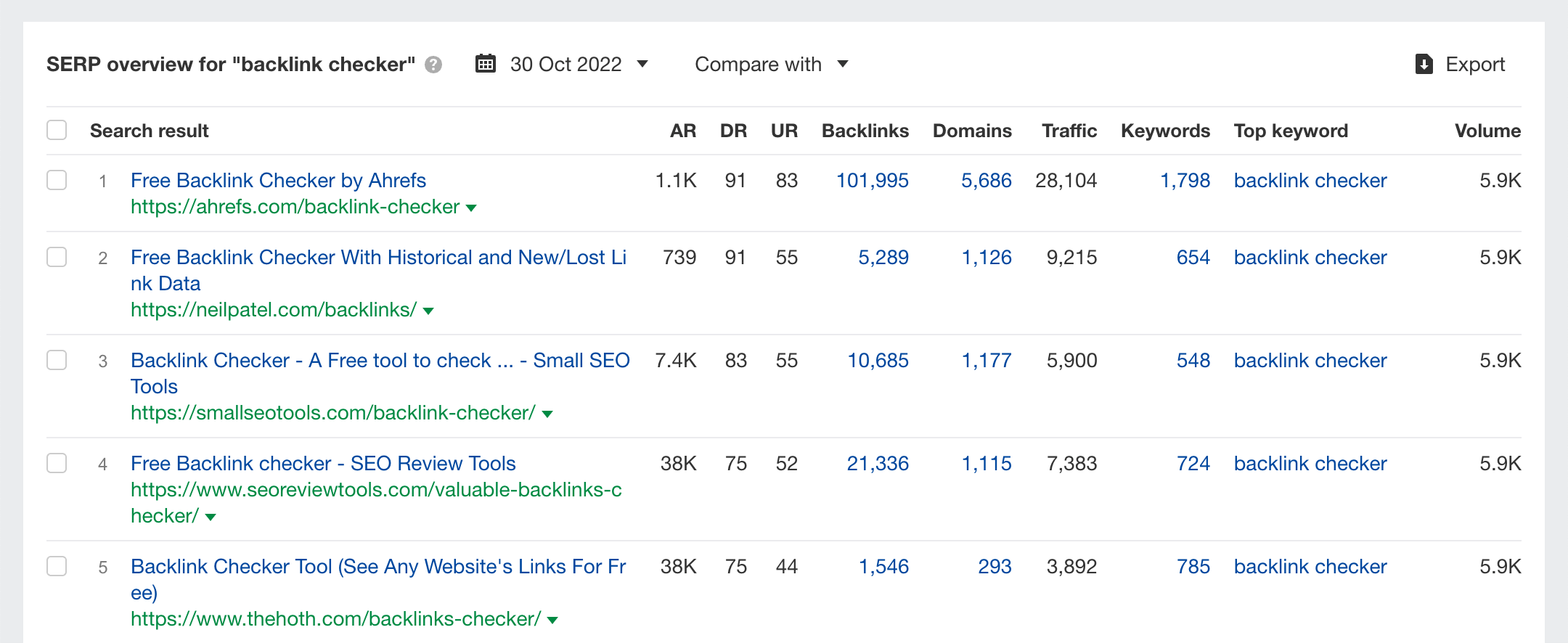 See the total number of backlinks and estimated organic search traffic to each ranking page, plus a few other important SEO metrics:
