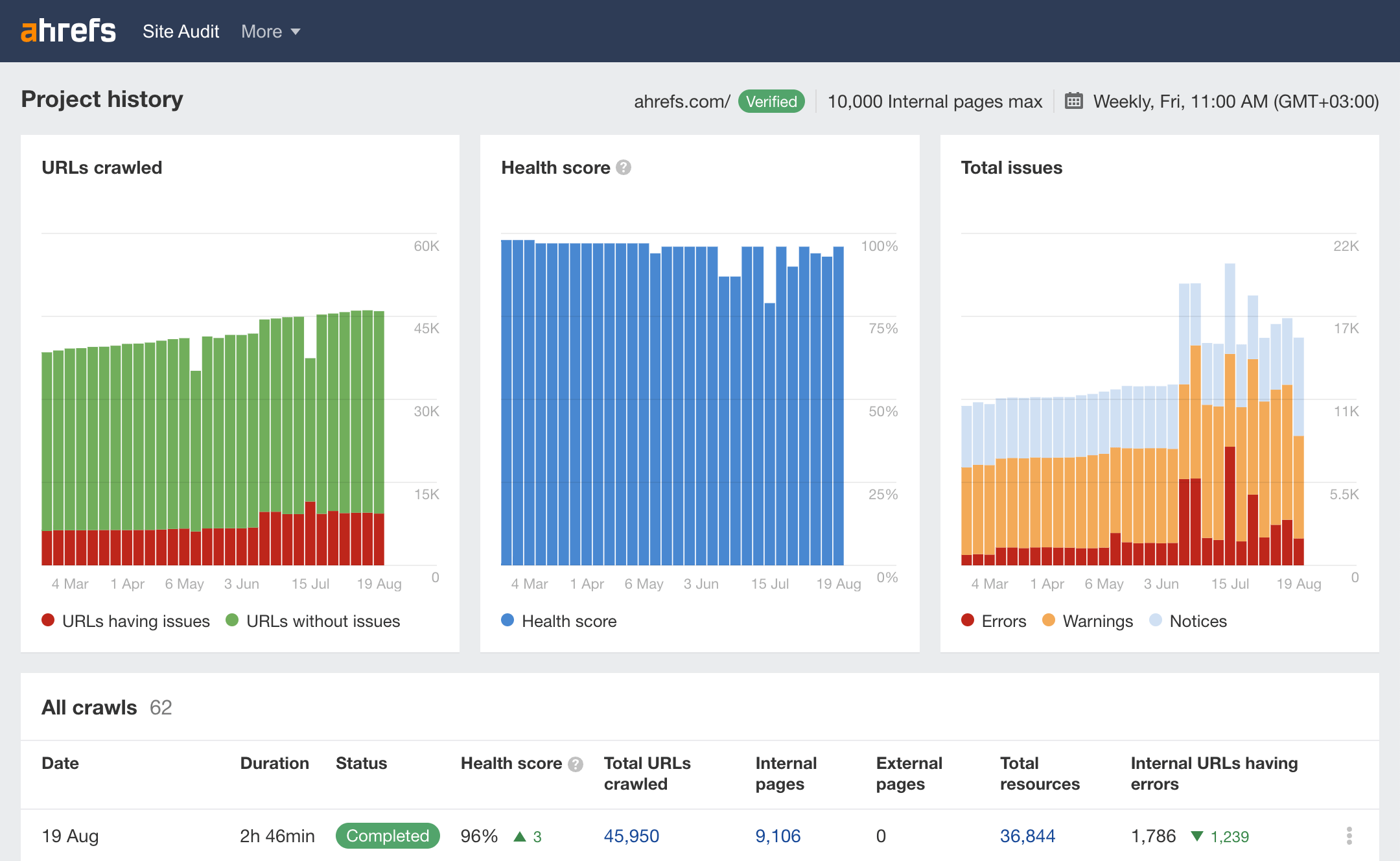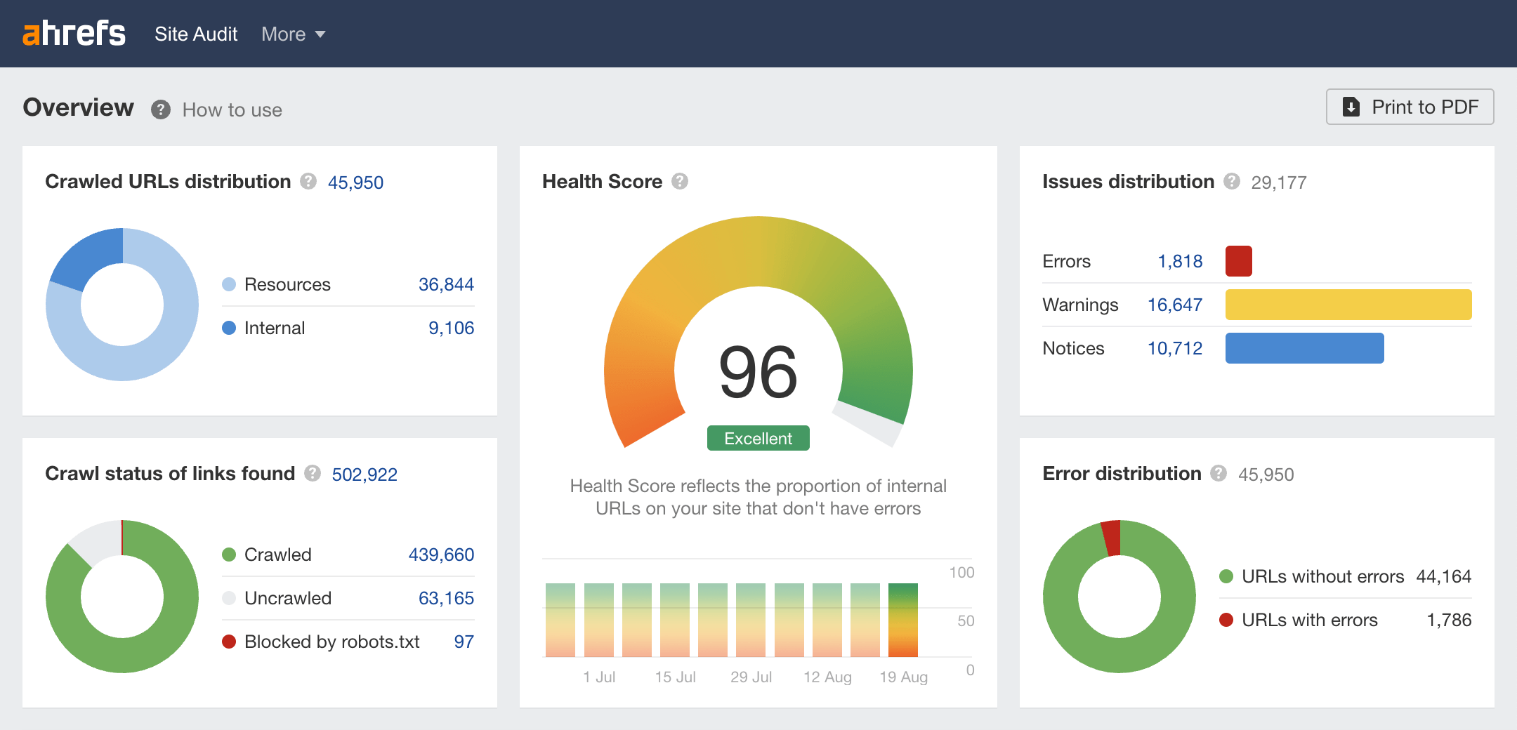 Health Score gives you a high-level overview of your SEO performance based on the number of errors found.