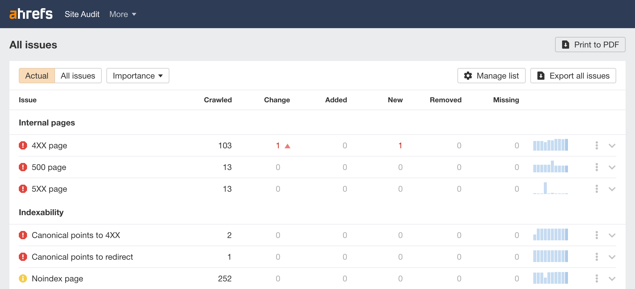 Go through all your SEO issues in the All issues overview report. Each issue is properly categorized, shows its importance and tells you how many pages are affected by it.
