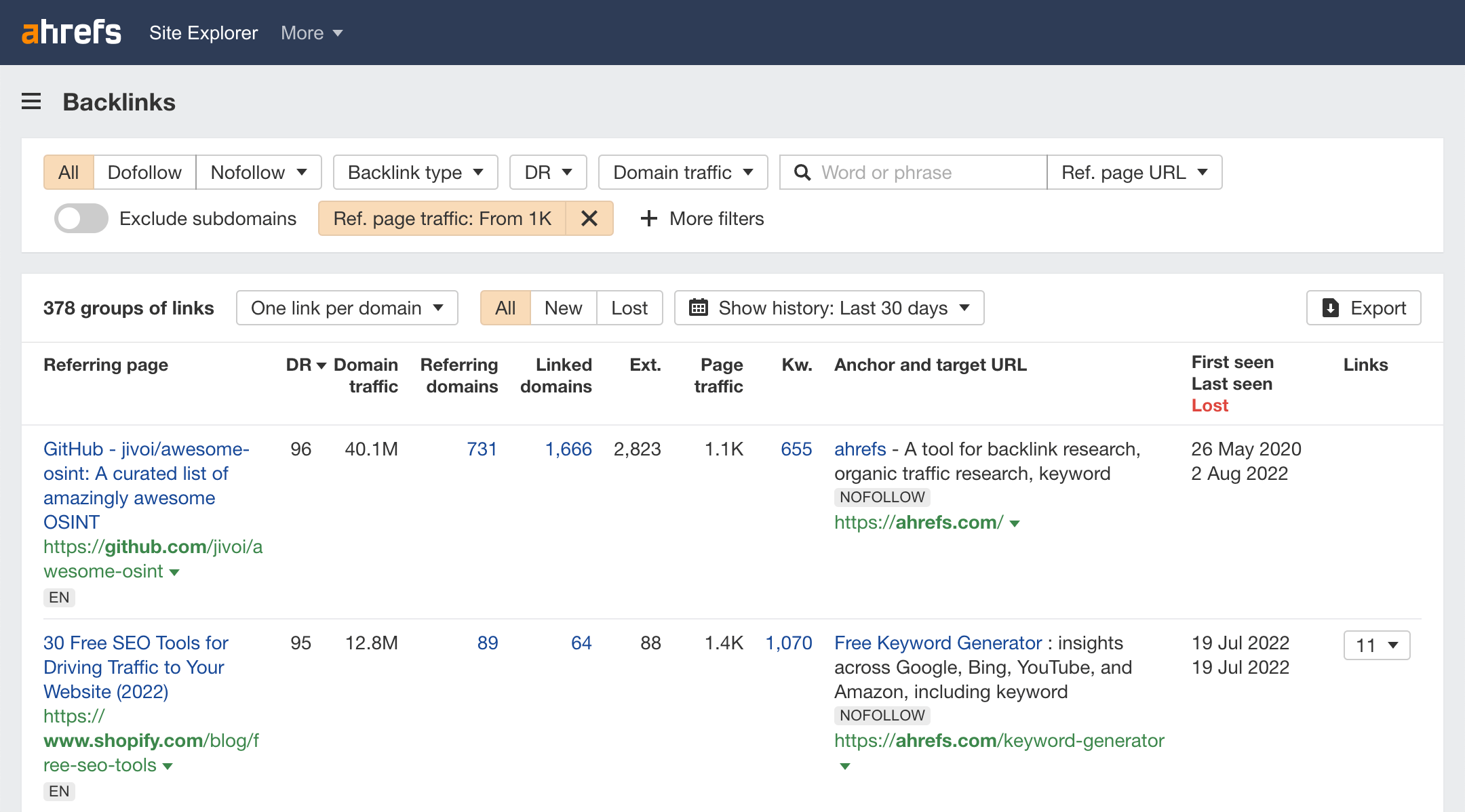 The free SEO audit tool goes beyond technical SEO. You can also check all backlinks pointing at your site with metrics such as their Domain Rating (DR) and estimated organic traffic.