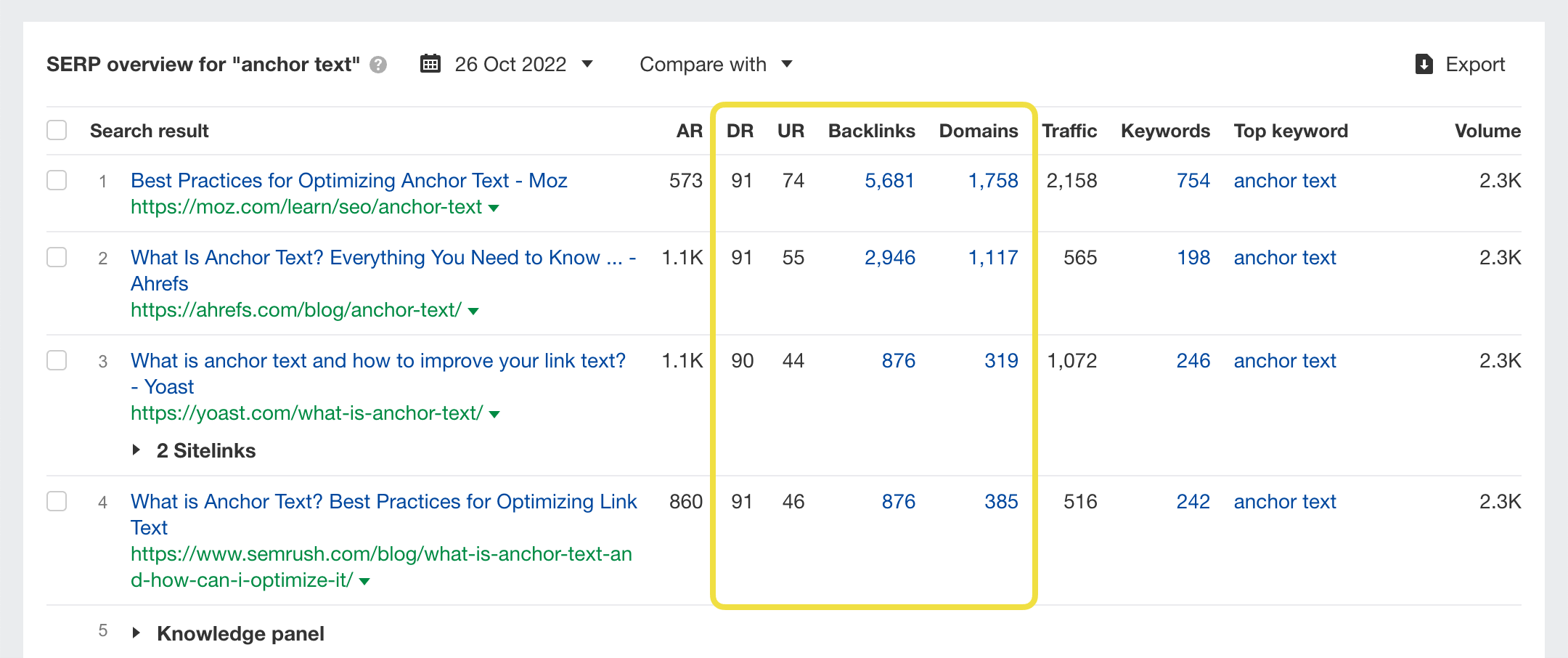 For every top-ranking page, we show you backlink metrics to help you gauge the competition and understand the ranking difficulty of a keyword: