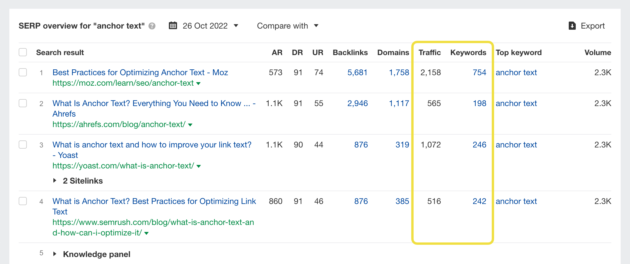 Once you know which pages on the SERPs get the most traffic, you can analyze them in Site Explorer to replicate their success.